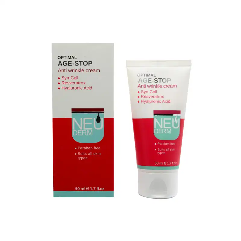 کرم ضد چروک نئودرم مدل Optimal Age-Stop حجم ۵۰ میلی لیتر جهت جلوگیری از پیری زودرس پوست تولید می شود. کرم ضد چروک نئودرم با ترکیباتی نظیر سین کول، رسوراتروکس (استخراجی از دانه انگور) و اسید هیالورونیک فرموله شده که این ترکیبات با تحریک تولید کلاژن به بازسازی پوست و جوانسازی آن کمک کرده و رطوبت مورد نیاز سلول های سطحی پوست را تأمین می کنند.